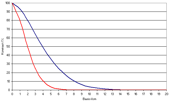 dargestellt. ![]() Abbildung 3 : Die MTF für ein Seeing von 1 Bogensekunde (blaue Linie) und 2 Bogensekunden (rote Linie). Aus Abbildung 3