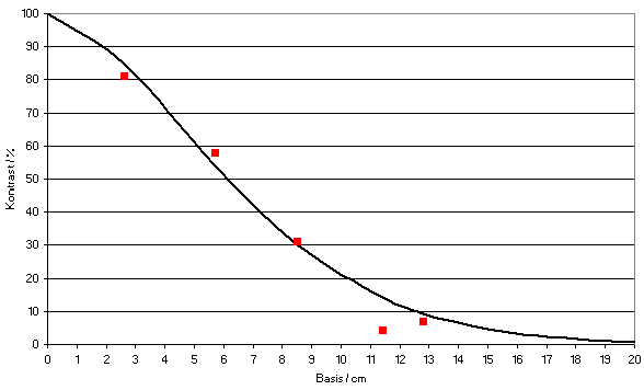 [8]. Abbildung 4 : Interferogramme für eine Belichtung von 4s und die dazugehörigen Intensitätsverläufe. Die Basis der Öffnungen der Scheinerblende beträgt von links nach rechts 2,6 cm, 5,7 cm, 8,5 cm, 11,4 cm und 12,8 cm. Aus den Helligkeiten der Interferenzstreifen kann der Kontrast ermittelt werden. Der Kontrast kann dabei Werte zwischen 0 und 100 % annehmen. Zur Ermittlung des Kontrastes werden die Bilder nicht aufbereitet, die Hintergrundhelligkeit (Rauschen) muss berücksichtigt werden. In Abbildung 5